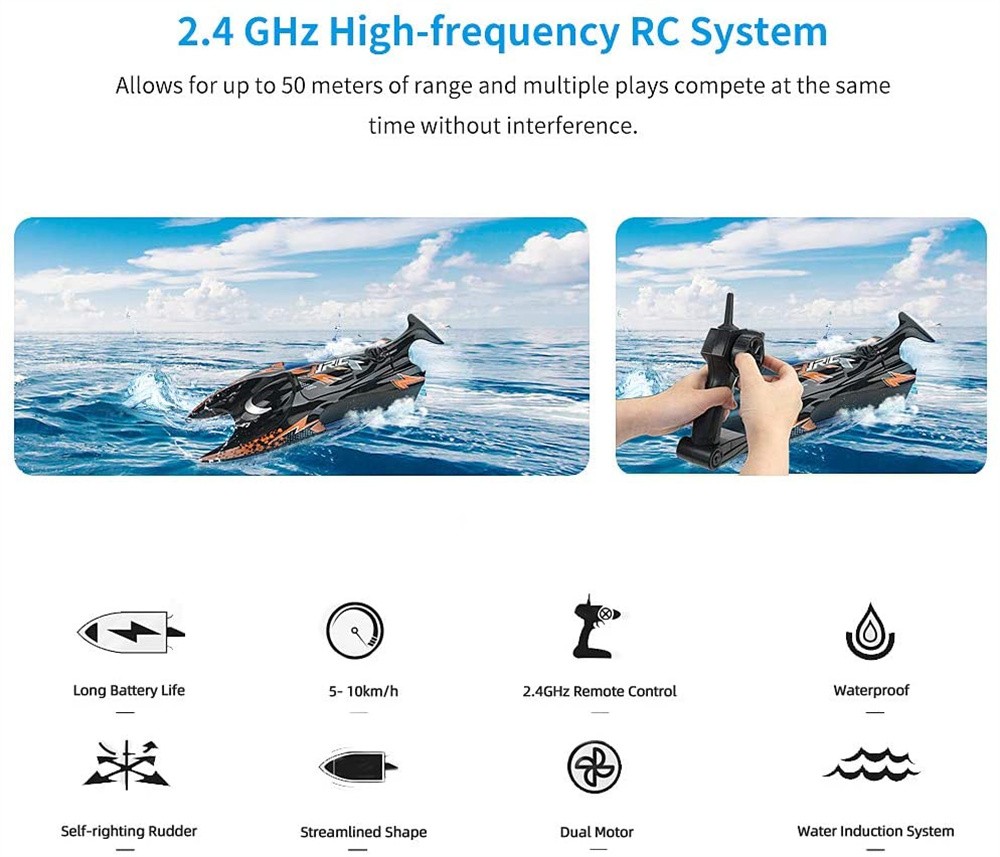 2.4G pistol grip remote control racing boat with long battery life. JJRC radio controlled boats can sail for 20 min if Battery fully charged. It has an ultra response speed and good anti-interference ability